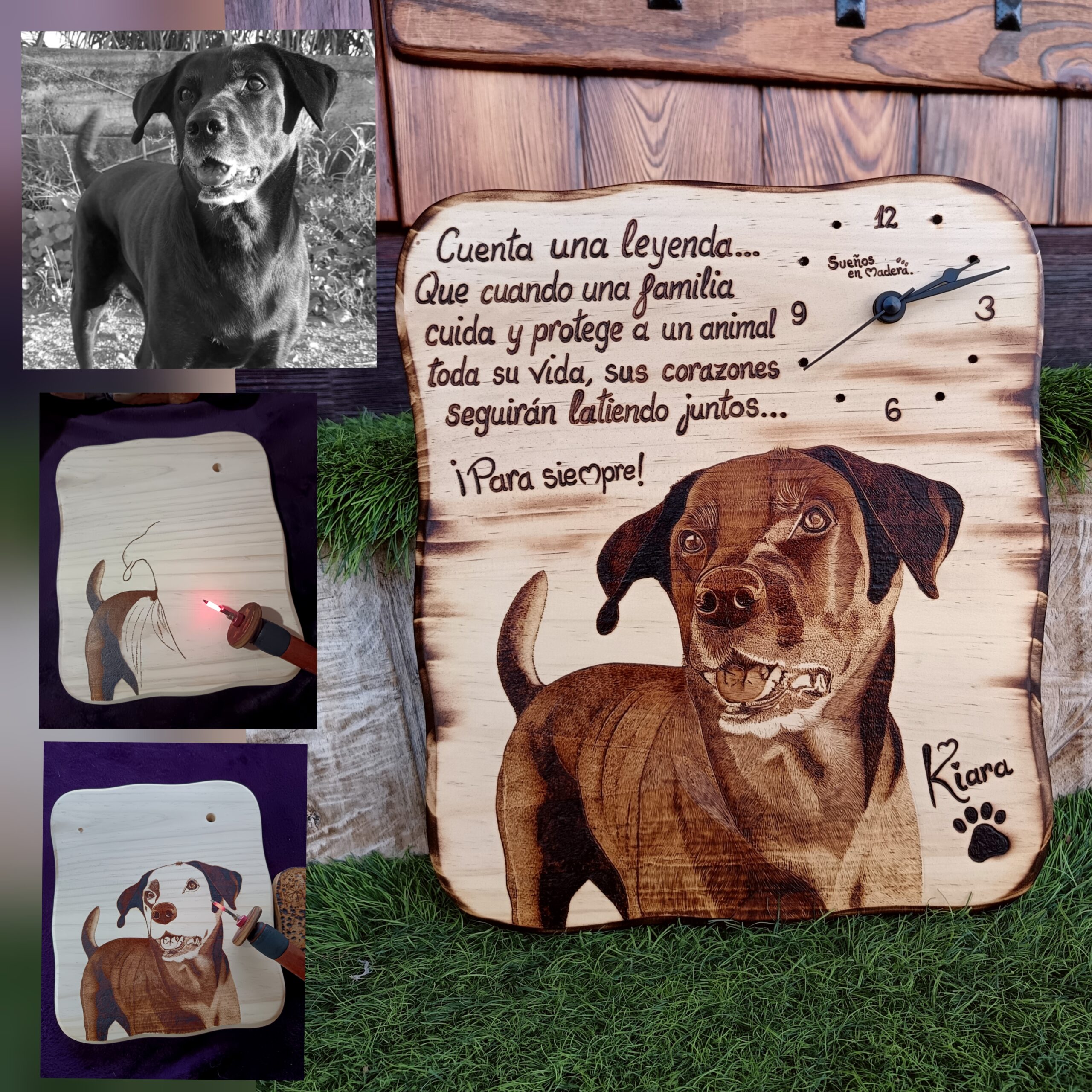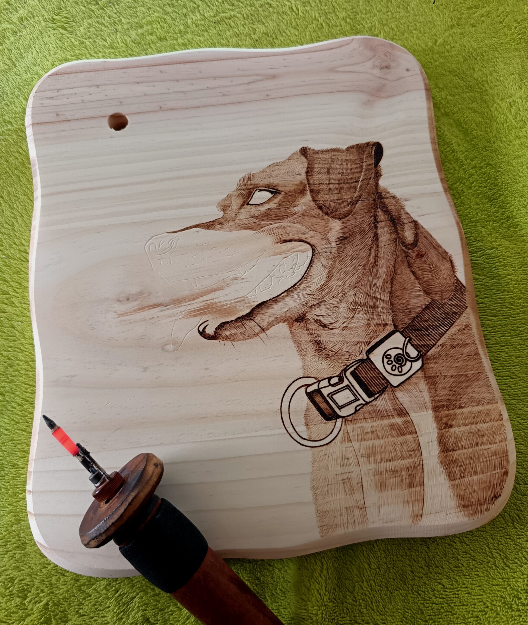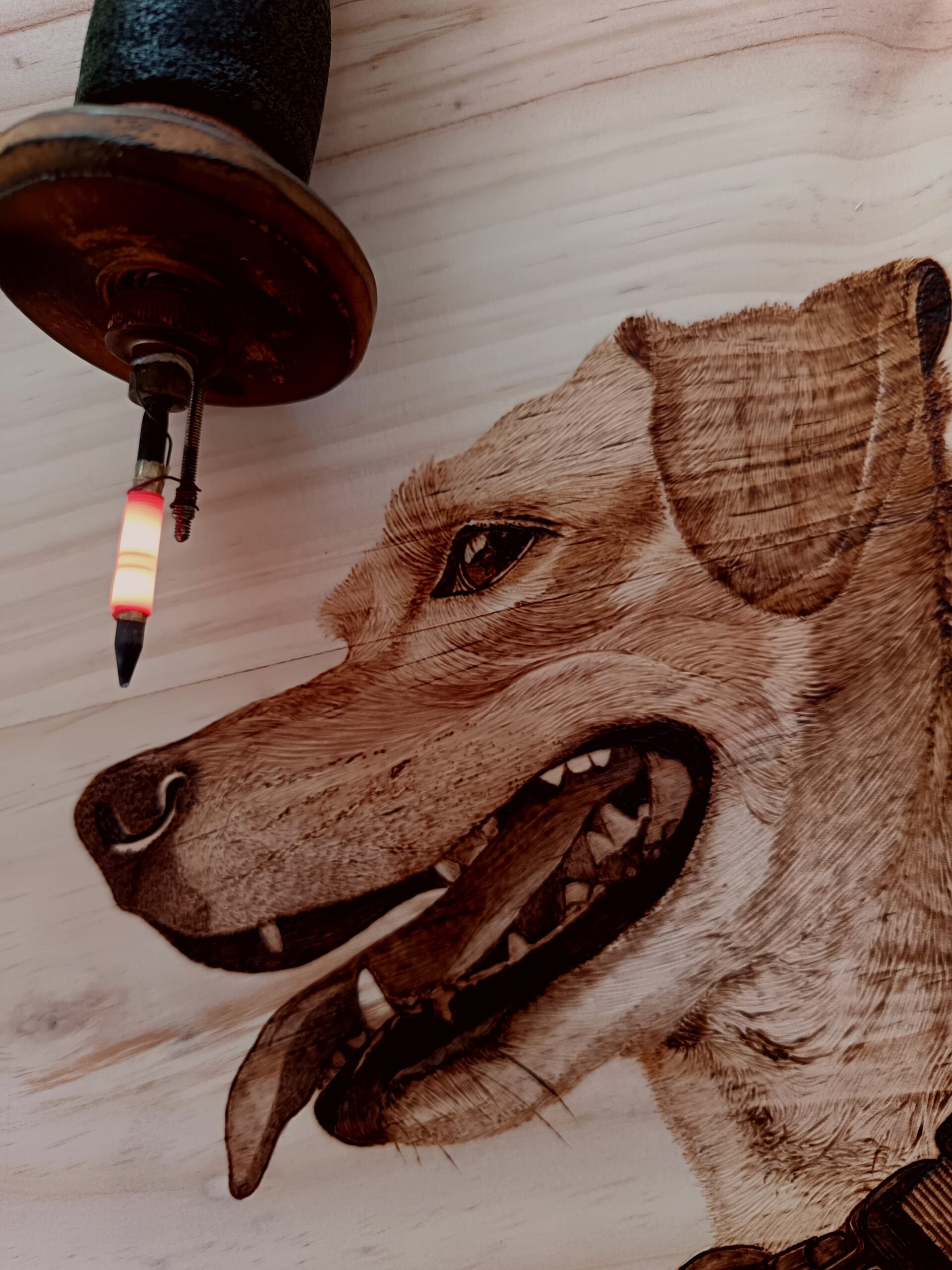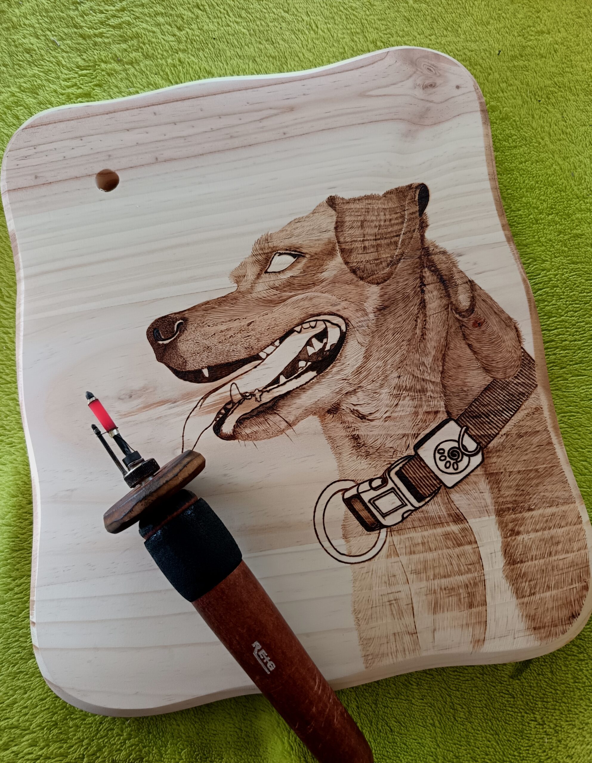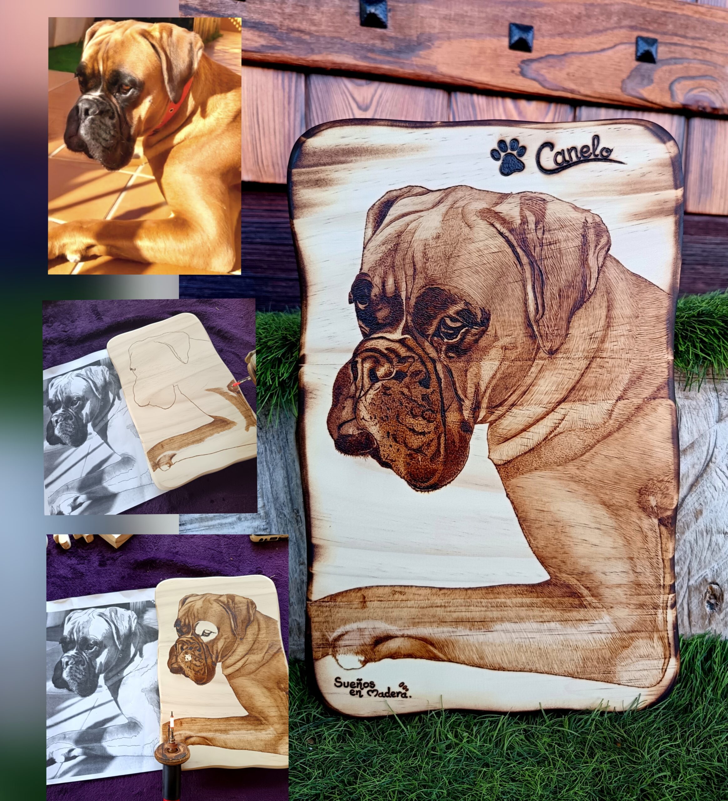 Un recuerdo único y emotivo: el retrato de tu mascota dibujado a fuego, con todo el detalle de nuestro pirograbado artesanal.
