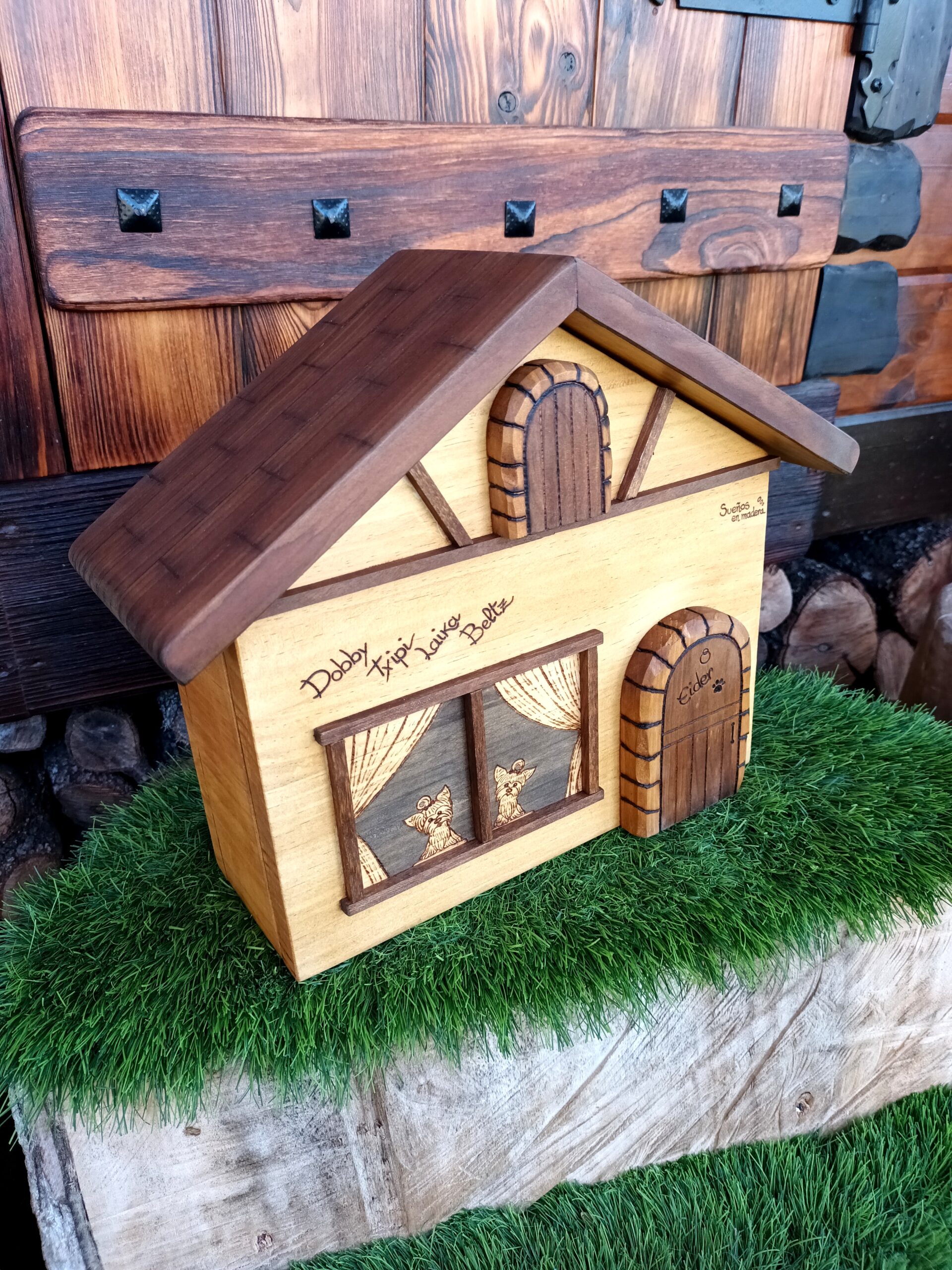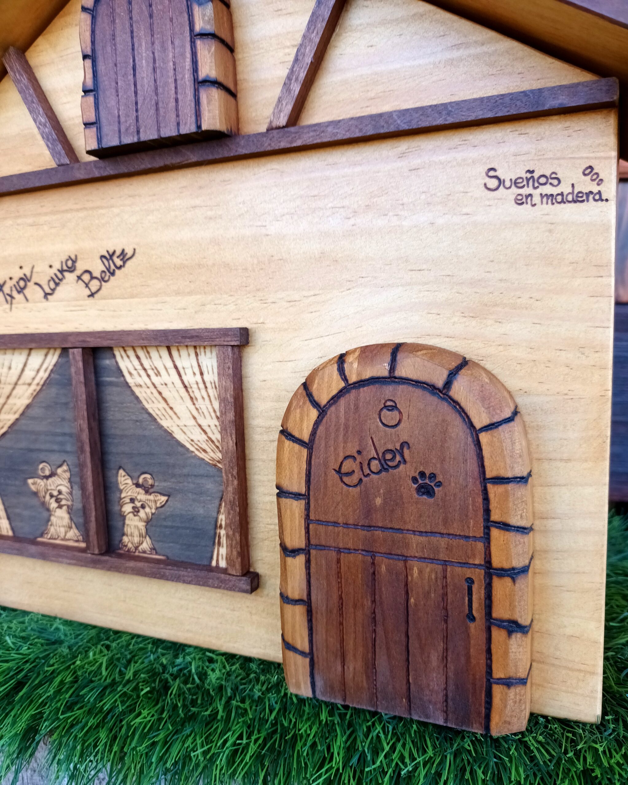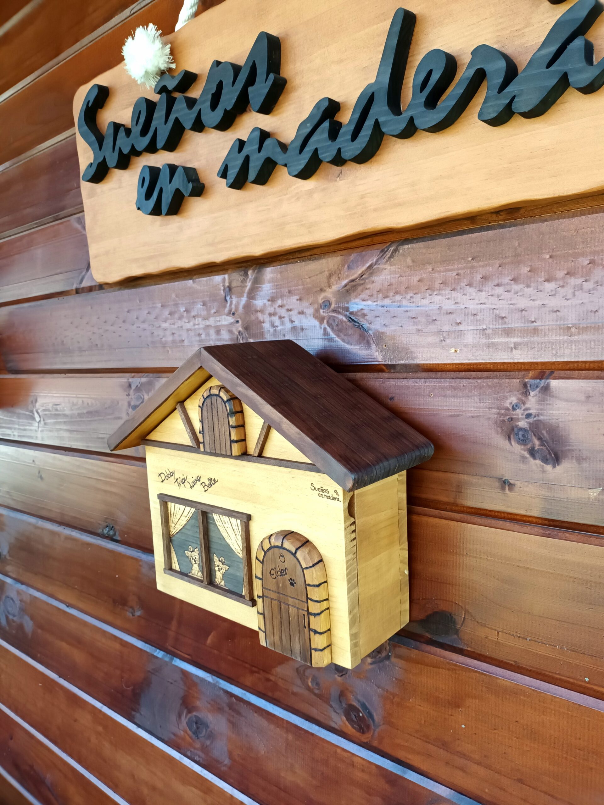 Eider quería algo especial para tener las llaves en casa, asomados por la ventana sus dos perritos y el nombre de los que han pasado por casa y dejaron su huella imborrable.