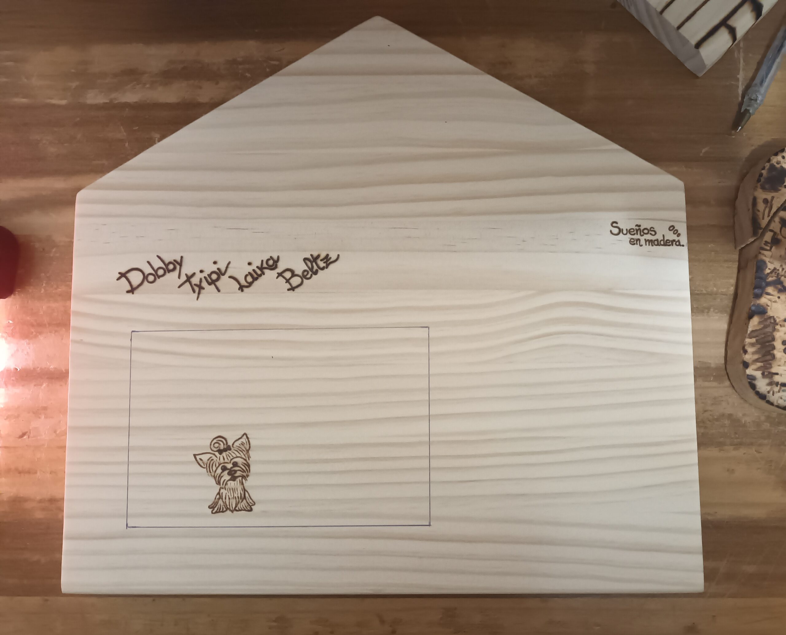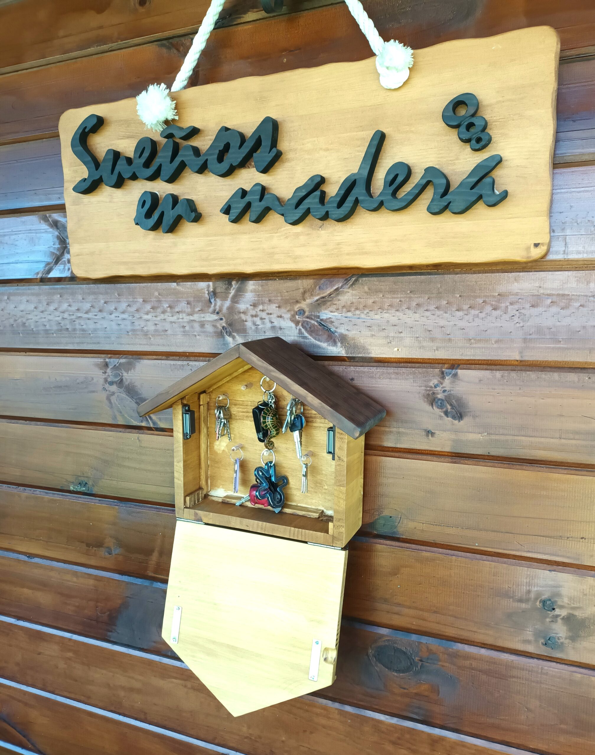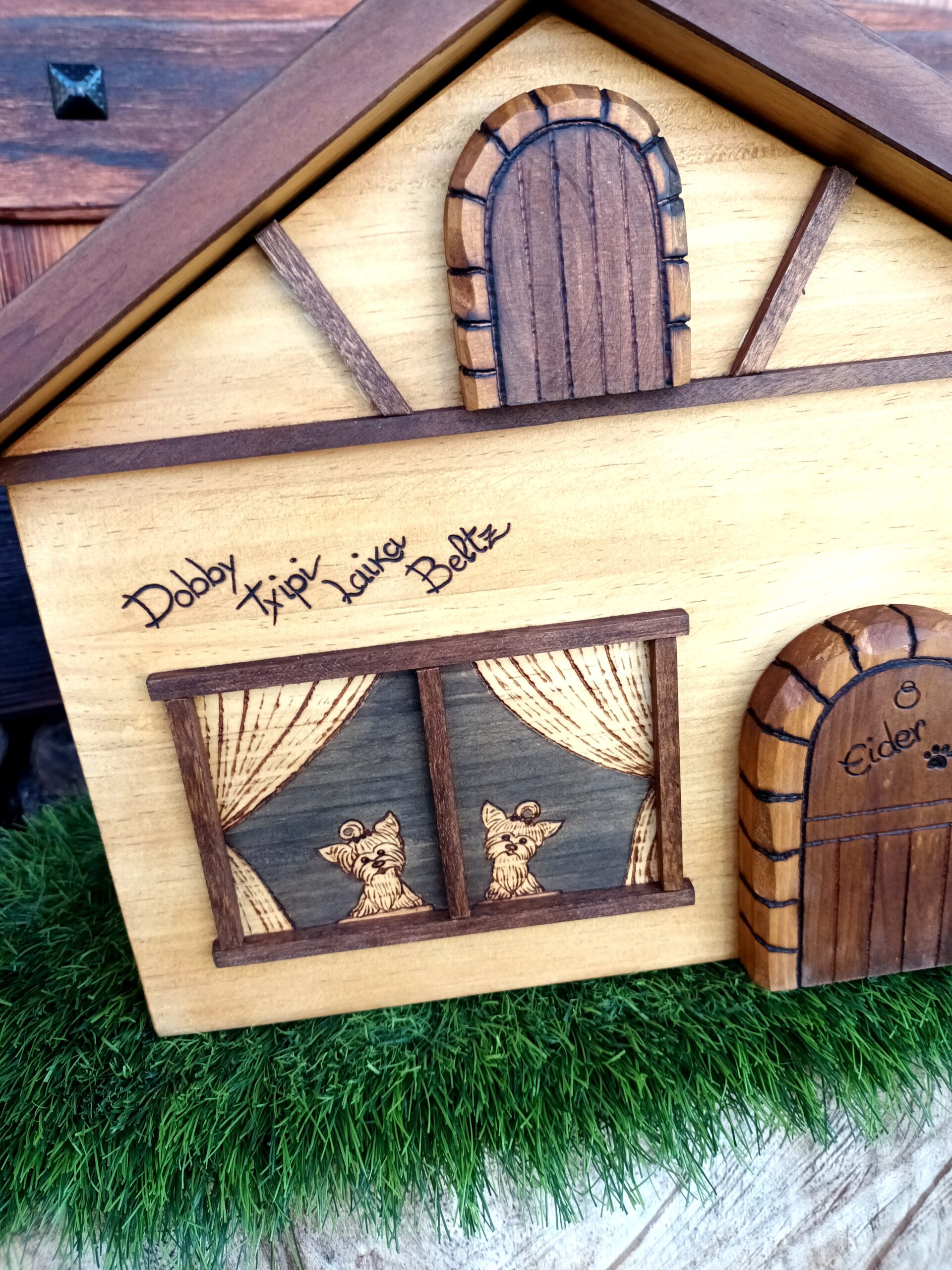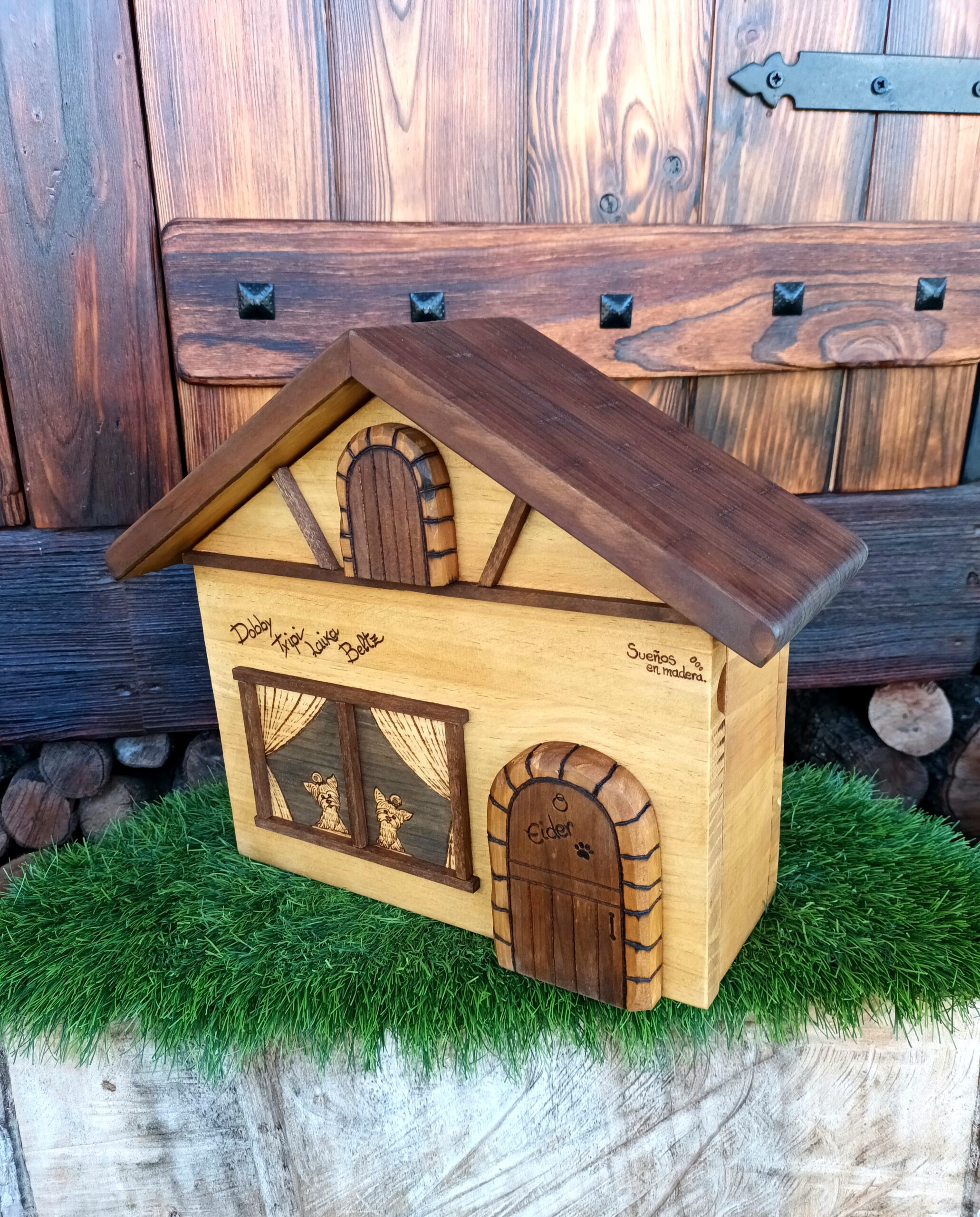 Eider quería algo especial para tener las llaves en casa, asomados por la ventana sus dos perritos y el nombre de los que han pasado por casa y dejaron su huella imborrable.