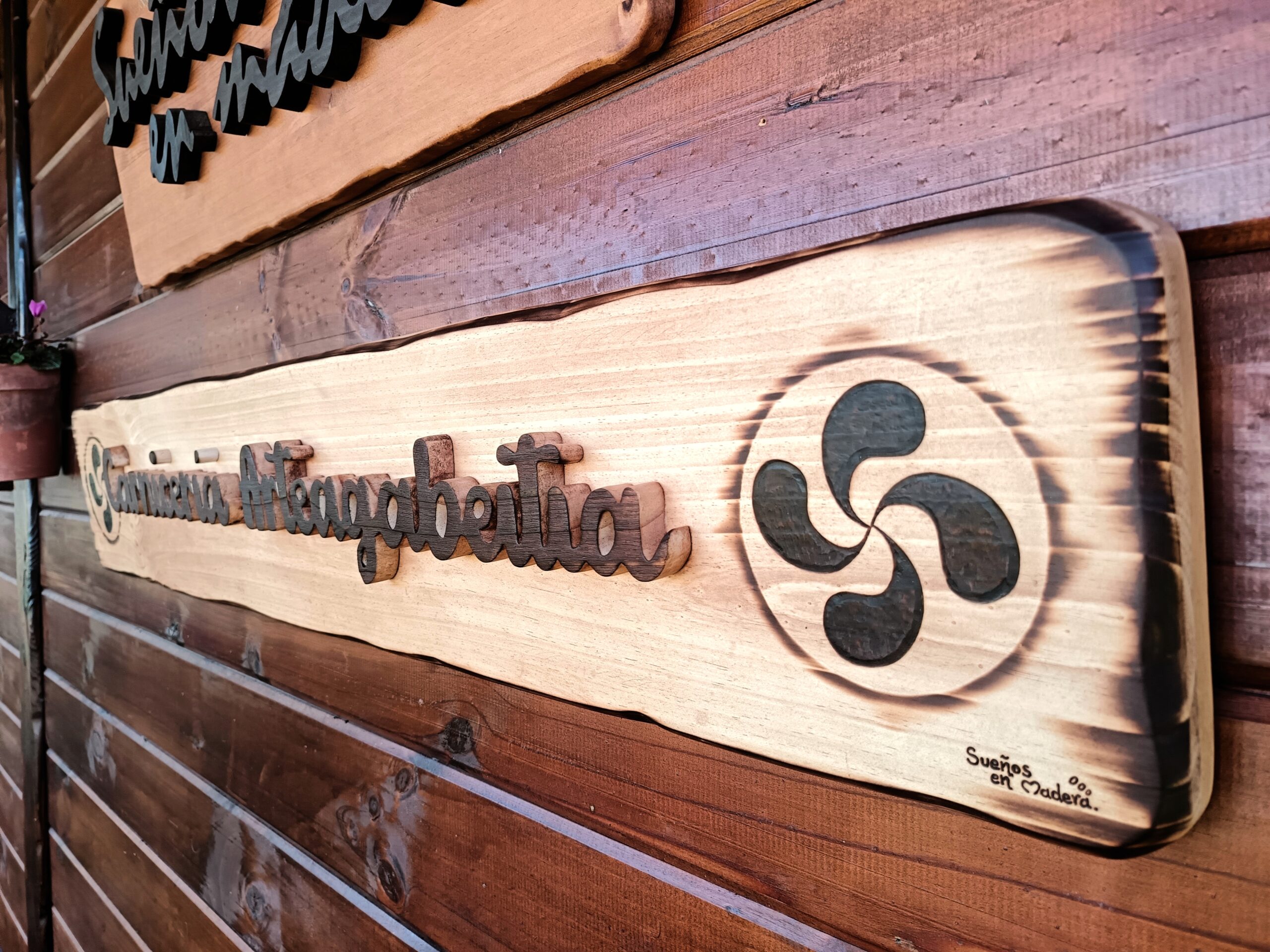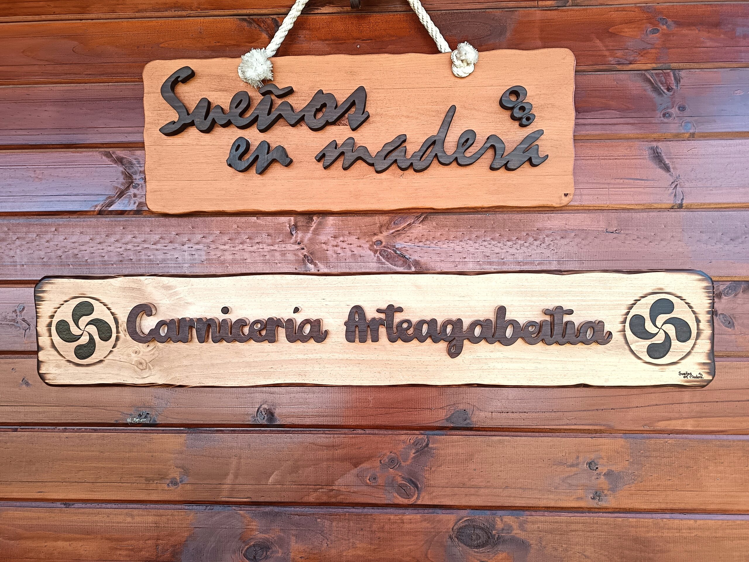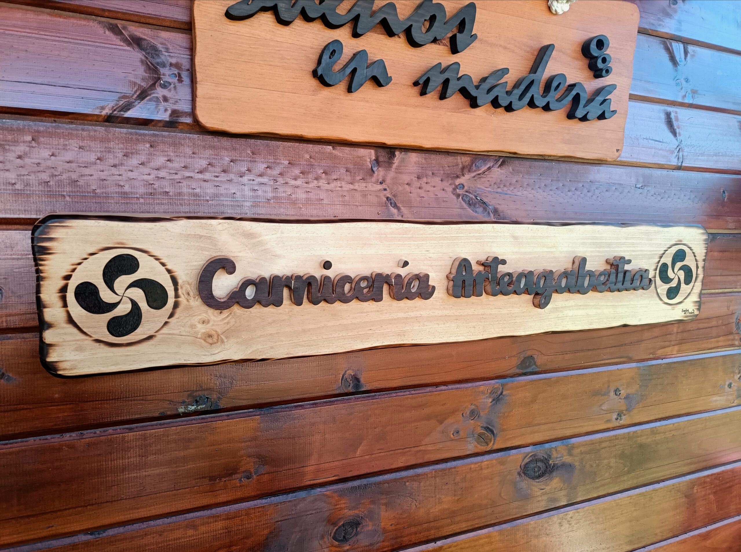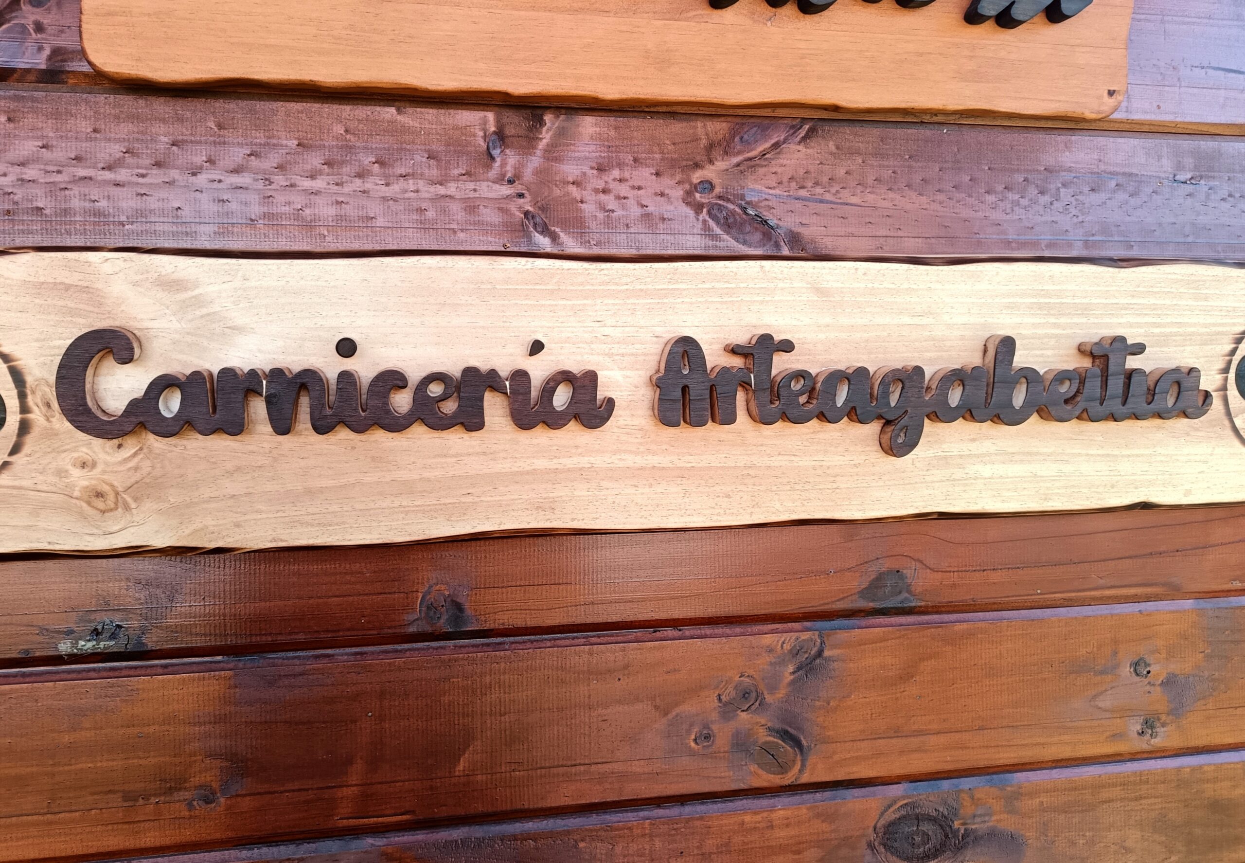 Así que nos pusimos manos a la obra con las ideas que ella ya tenía bastante claras y yo enseguida capté, buscamos una letra chula y ... Salió este precioso cartel que ya lucen con orgullo desde hace días a la vista de todo el que entra a la Carnicería Arteagabeitia.